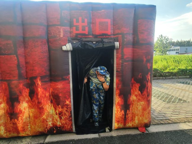 在烟雾逃生帐篷内,模拟的环境让同学们切身感受到火灾现场的紧张氛围,并通过实践掌握了低姿疏散、湿毛巾捂口鼻等关键自救技能,从而深刻认识到科学逃生方法的重要性。
