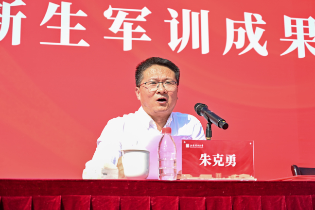 朱克勇宣读《关于表彰军训先进个人及集体的决定》,表彰在军训中表现突出的个人与集体,激励全体新生以榜样为镜,勇毅前行。