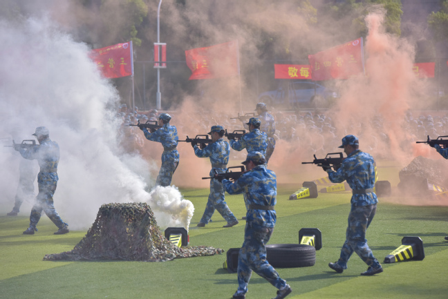 在庄严的国歌声中,国旗冉冉升起,大会拉开帷幕。三个方队进行了格斗、战术、队列的汇报展示。